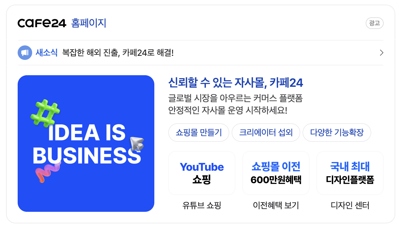 카페24로 디지털 온라인 마켓에 ‘내 가게’의 첫 문을 열어보는것도 좋은 방법이네요.